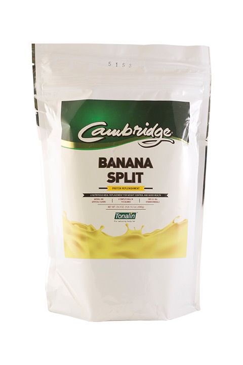 The Original Cambridge Diet formula, Banana Split with Tonalin CLA has 1 gram of Tonalin per serving, contains less sodium than the Original Banana Cream and is considered a low-lactose formula. Tonalin helps reduce body fat in three ways: Reduces body fat by up to 10%, maintains and increases lean muscle mass and prevents fat regain. 110 calories per serving and 23 servings per pouch.